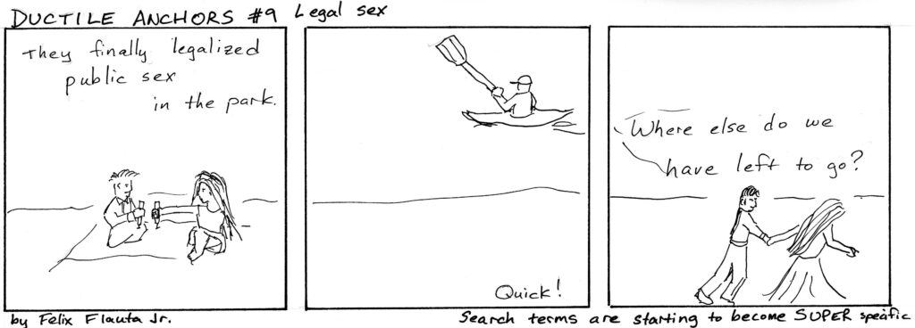 Recently I learned that they had legalized public sex at Vondelpark in Amsterdam. I looked up images (of the park, not the sex you sickos) and did an absolutely rough sketch of some space by a river. there was also a statue on the other side of this waterway, but it didn’t fit my 3 panel structure (yet another argument for four panels I suppose).