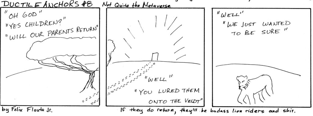 So yeah, I had to add the postscript of the parents returning home across the virtual universes as badass barbarians riding lions instead of being eaten by them.
